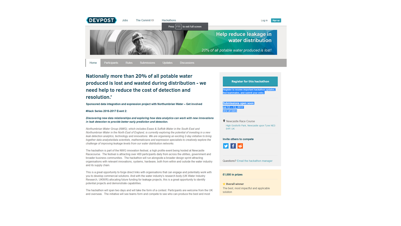 The hackathon is part of the NWG innovation festival, a high profile event being hosted at Newcastle Racecourse. The festival is attracting over 400 participants daily from across the utilities, government and broader business communities. The hackathon will run alongside a broader design sprint attracting organisations with relevant innovations, systems, hardware, both from within and outside the water industry and its supply chain.